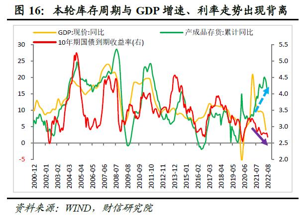Whether the PPI price index has dropped first or the current replenishment time has reached the highest level in history, it is a high probability event for China to enter a new round of destocking cycle in the future (see Figure 15). What needs to be pointed out here is that since 2021, the growth rate of domestic inventory has been greatly deviated from the growth rate of GDP and the trend of interest rate level, that is, while enterprises replenish inventory, the economic growth rate has dropped rapidly and sharply, and the interest rate has also dropped (see Figure 16). The reason is that the macro-and micro-policies have been tightened simultaneously in 2021, which has led to the rapid and substantial reduction of the leverage ratio of entities (see Figure 17). Coupled with the epidemic disturbance this year, demand has shrunk rapidly and inventory has been passively improved. Therefore, to judge the future trend of economy and interest rate, we need to comprehensively consider many factors such as inventory cycle, epidemic situation and counter-cyclical policy, and we can’t just observe one indicator of inventory cycle.