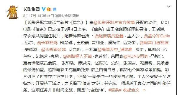 The dubbed version of Tenet Mandarin was translated by Changchun Film Studio, directed by Wang Xiaowei, and voiced by Zhao Xin, Meng Lingjun and Yang Ming respectively.